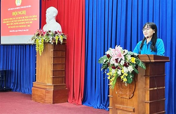 Đ/c Nguyễn Thị Hằng - Phó Chủ tịch LĐLĐ tỉnh báo cáo tại Hội nghị