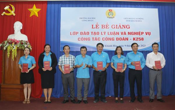Kết thúc khóa học, Trường Đại học Công đoàn đã cấp chứng chỉ công nhận hoàn thành khóa học cho 29 học viên là cán bộ công đoàn các cấp của hệ thống Công đoàn Khánh Hòa. Trong đó, 12 học viên xếp loại Xuất sắc, 09 học viên xếp loại Giỏi và 08 học viên xếp loại Khá. Dịp này, Hiệu trưởng Trường Đại học Công đoàn cũng đã tặng Giấy khen cho 06 học viên.