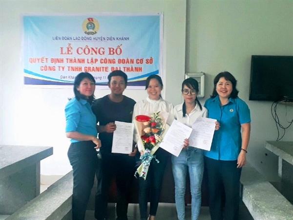 Sau gần 02 tháng, với sự tích cực của Ban Vận động thành lập công đoàn đã giúp người lao động nhận thức rõ về chức năng, nhiệm vụ của tổ chức công đoàn Việt Nam. Cùng với sự đồng thuận cao và trách nhiệm của Ban giám đốc công ty TNHH Granite Đại Thành về thành lập tổ chức công đoàn, kết quả đã có 20/21 công nhân lao động tự nguyện viết đơn gia nhập tổ chức Công đoàn. Ban Thường vụ Liên đoàn Lao động huyện Diên Khánh đã trao quyết định thành lập Công đoàn cơ sở công ty TNHH Granite Đại Thành, gồm 20 đoàn viên và quyết định công nhận Ban Chấp hành Công đoàn cơ sở gồm 03 ủy viên (bà Lê Thị Phượng Cầm giữ chức vụ Chủ tịch CĐCS).