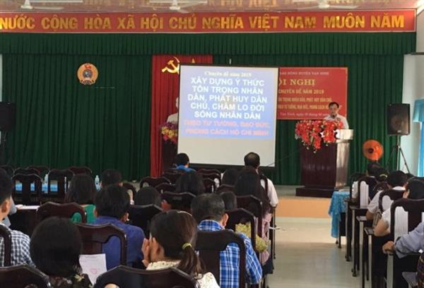 Đồng chí Nguyễn Thanh Nghị đã truyền đạt những nội dung học tập chuyên đề 2019 về tôn trọng Nhân dân, phát huy dân chủ, chăm lo đời sống nhân dân được thể hiện là phải có thái độ đánh giá cao vai trò, vị trí của nhân dân đặc biệt chú ý không xâm phạm đến lợi ích, quyền lợi hợp pháp, không xúc phạm nhân dân; luôn luôn tôn trọng và giữ gìn của công, của nhân dân; phong cách lãnh đạo dân chủ thì phải dựa vào quần chúng; là cán bộ lãnh đạo, nhất là người đứng đầu không được quan liêu, hách dịch, coi thường quần chúng nhân dân; Phải biết đời sống thực của nhân dân như thế nào, khả năng thực của nhân dân ra sao? Họ đang nghĩ và đang mong muốn những gì? Mỗi lời nói, mỗi việc làm của người cán bộ phải phù hợp với quần chúng, phản ánh đúng được khát vọng của quần chúng. Cán bộ phải biết được những băn khoăn trăn trở của dân để kịp thời uốn nắn và tháo gỡ cùng dân. Ngoài ra, đồng chí cũng dẫn chứng những câu chuyện về Bác trong phê bình cách lãnh đạo của một số cán bộ không dân chủ, dẫn đến tình trạng người có ý kiến không dám nói, người muốn phê bình không dám phê bình, làm cho cấp trên cấp dưới cách biệt nhau, quần chúng với Đảng xa rời nhau, không còn sáng kiến, không còn hăng hái trong khi làm việc.