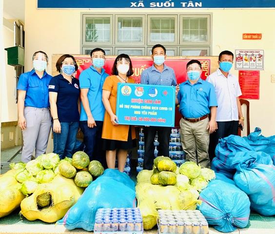 Phát huy tinh thần lá lành đùm lá ránh của nhân dân ta, sáng này 13/7/2021, đoàn công tác đến thăm hỏi, động viên và hỗ trợ các cán bộ chiến sỹ đang trực tại 6 chốt phong tỏa tại xã Suối Tân với tổng số tiền 12 triệu đồng. Đoàn còn trực tiếp hỗ trợ nhu yếu phẩm gồm rau củ quả, nước uống, trứng gà… cho bà con nhân dân trong các khu vực bị phong tỏa với tổng số tiền là 28,6 triệu đồng.