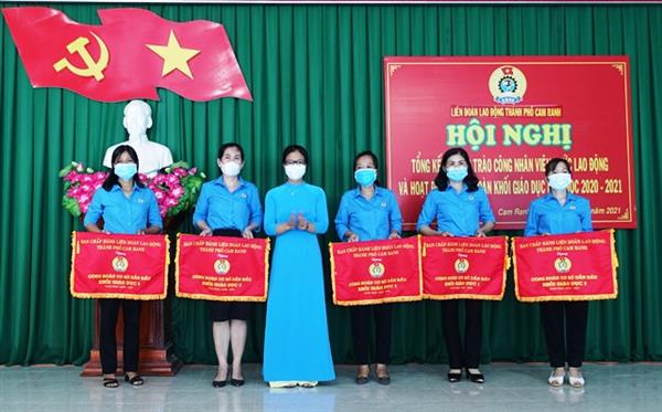 Đ/c Vũ Thị Yên - Chủ tịch LĐLĐ TP. Cam Ranh trao Cờ thi đua cho các đơn vị xuất sắc