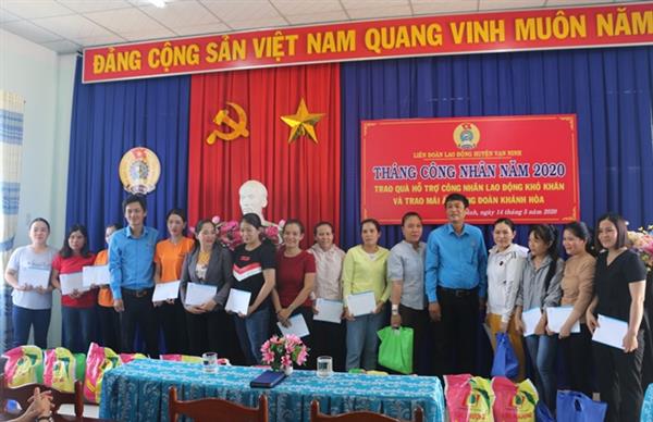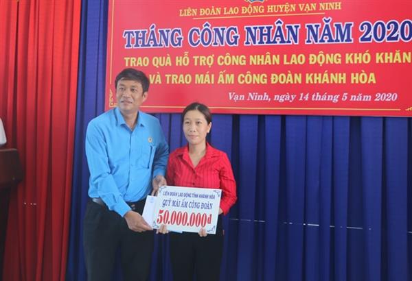 Hưởng ứng Tháng Công nhân năm 2020, chiều 14/5, Liên đoàn Lao động huyện Vạn Ninh tổ chức trao quà hỗ trợ và kinh phí xây mái ấm công đoàn cho đoàn viên, người lao động có hoàn cảnh khó khăn, bị ảnh hưởng bởi dịch Covid-19 trên địa bàn huyện với tổng trị giá 75 triệu đồng.