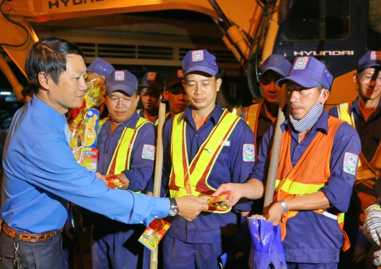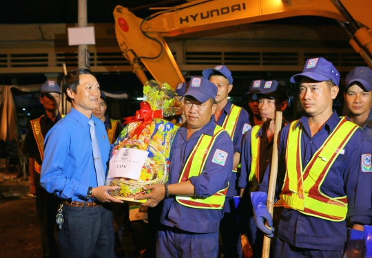 Đồng chí Ngô Anh Duyệt – Chủ tịch LĐLĐ thành phố đã ân cần thăm hỏi đời sống và việc chuẩn bị tết của công nhân khi làm việc đêm giao thừa; đồng thời động viên và ghi nhận tinh thần làm việc trách nhiệm của công nhân luôn giữ cho đường phố luôn sạch sẽ, tinh tươm, nhất là trong đêm giao thừa.