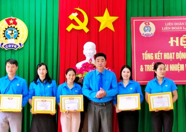 Đ/c Nguyễn Ngọc Thu - Chủ tịch LĐLĐ huyện trao tặng giấy khen cho các cá nhân xuất sắc