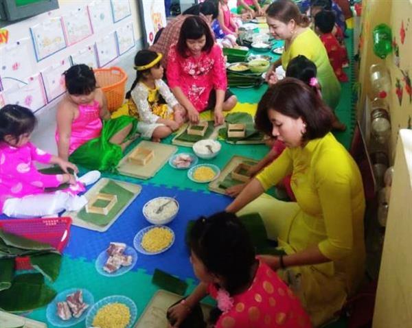 Các cô giáo hướng dẫn các cháu gói bánh chưng trong dịp Tết cổ truyền