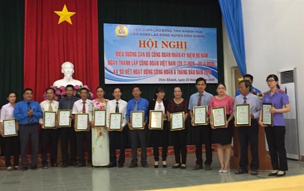 Nhân dịp này, LĐLĐ huyện Diên Khánh tặng kỷ niệm chương “Vì sự nghiệp xây dựng tổ chức công đoàn” cho 11 đồng chí cán bộ công đoàn; biểu dương 42 cán bộ công đoàn tiêu biểu “Vì có nhiều đóng góp cho sự phát triển của tổ chức công đoàn”.