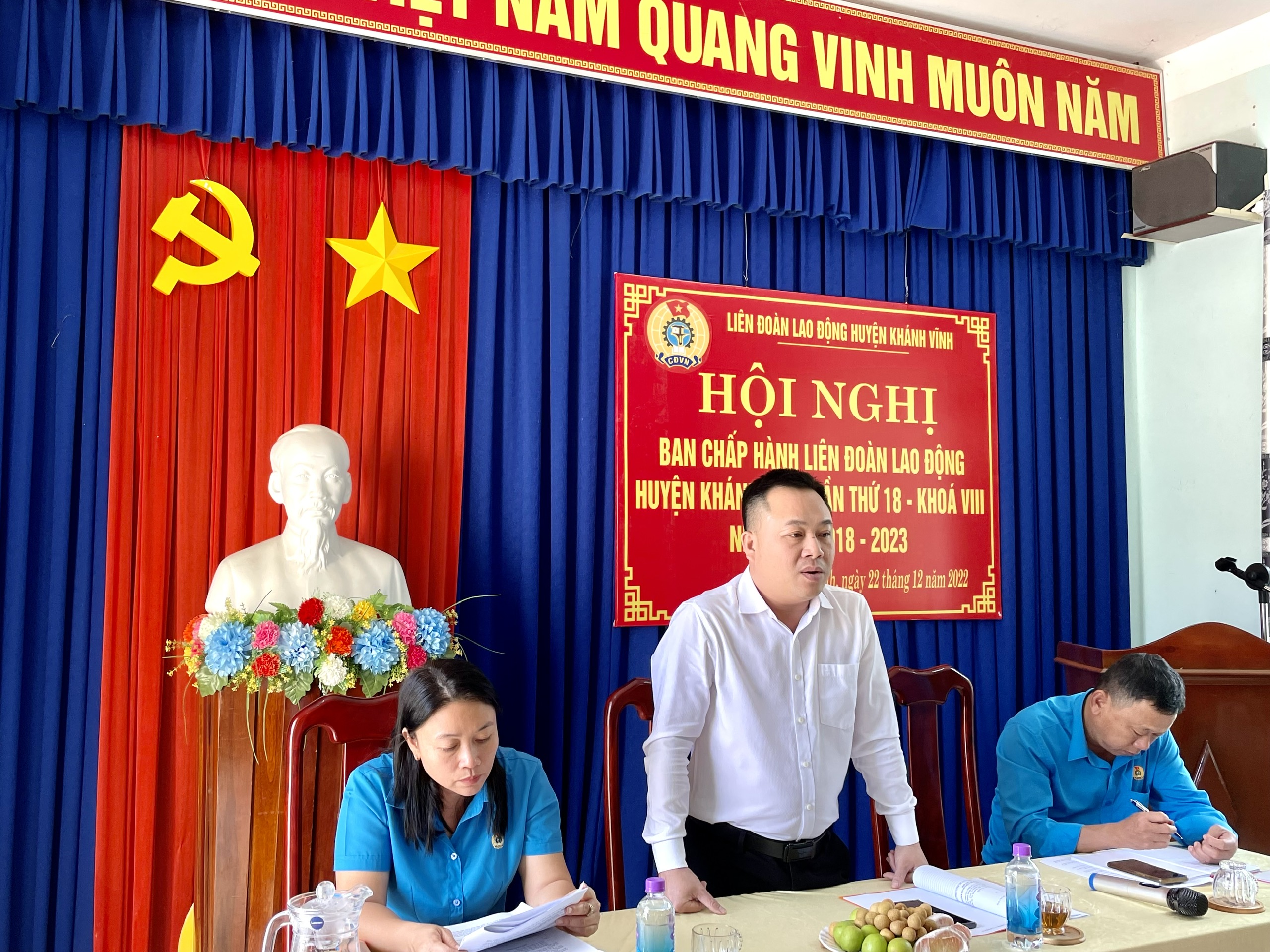 Tại Hội nghị, các đại biểu đã thảo luận và thống nhất Dự thảo lần 1 Báo cáo của Ban Chấp hành LĐLĐ huyện (khóa VIII) tại Đại hội IX Công đoàn huyện Khánh Vĩnh, số lượng đại biểu triệu tập dự Đại hội công đoàn huyện lần thứ IX, nhiệm kỳ 2023-2028 là 160 đại biểu; công tác nhân sự Ban Chấp hành Công đoàn huyện nhiệm kỳ 2023-2028….