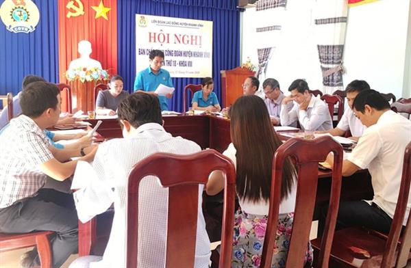 Mới đây, Liên đoàn Lao động (LĐLĐ) huyện Khánh Vĩnh tổ chức Hội nghị đánh giá tình hình hoạt động công đoàn quý I và triển khai nhiệm vụ công tác 9 tháng cuối năm 2020, do đồng chí Nguyễn Thị Việt- Chủ tịch LĐLĐ huyện chủ trì.
