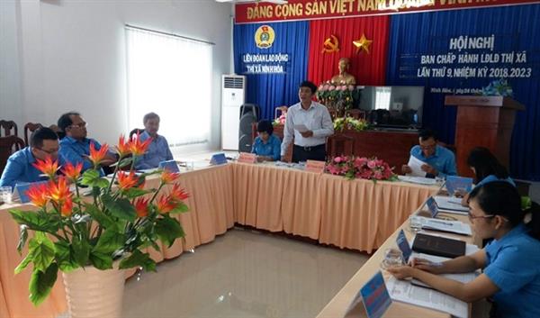 Năm 2019, LĐLĐ thị xã triển khai, hướng dẫn các cấp công đoàn trong thị xã tổ chức thực hiện tốt nhiệm vụ đã đề ra. như: Tổ chức thành công Lễ Kỷ niệm 90 năm Ngày thành lập Công đoàn Việt Nam, biểu dương 90 tập thể, cá nhân xuất sắc, tiêu biểu và vinh danh các đồng chí lãnh đạo thị xã vì những đóng góp cho sự phát triển của tổ chức Công đoàn; Khảo sát, tuyên truyền, vận động 20 lao động hành nghề xe ôm tự do gia nhập vào tổ chức Công đoàn và ra mắt thành lập Nghiệp đoàn Xe ôm Ninh Hòa. Đây là Nghiệp đoàn Xe ôm đầu tiên được thành lập tại Khánh Hòa, đã góp phần tạo ra bước đổi mới cách tổ chức tập hợp đoàn viên và xây dựng tổ chức Nghiệp đoàn vững mạnh.