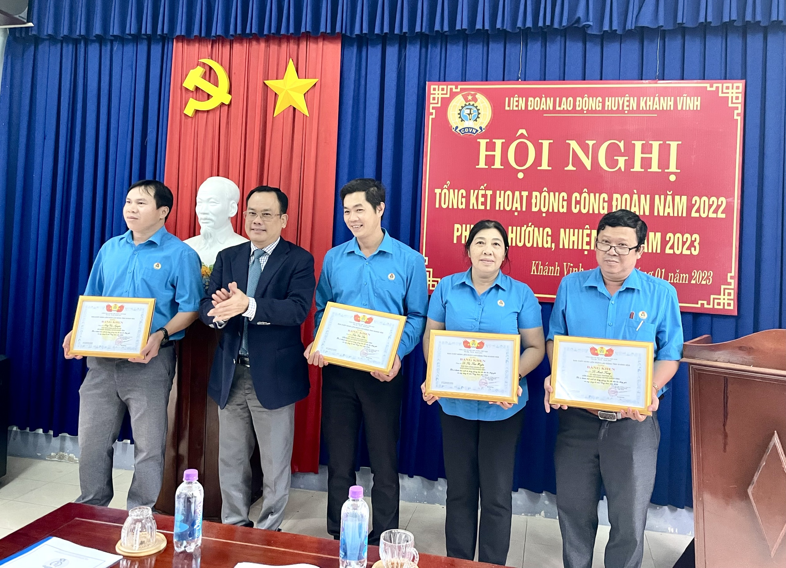Nhằm đánh giá hoạt động Công đoàn, Liên đoàn Lao động huyện Khánh Vĩnh tổ chức Hội nghị tổng kết công tác công đoàn năm 2022, triển khai nhiệm vụ năm 2023. Dự hội nghị có đồng chí Đặng Văn Tuấn, Phó Bí thư thường trực Huyện ủy; đồng chí Nguyễn Thị Việt, Chủ tịch LĐLĐ huyện; Các đồng chí Chủ tịch công đoàn cơ sở khối cơ quan, doanh nghiệp, xã, thị trấn.