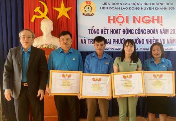 Ghi nhận những thành tích đạt được, LĐLĐ tỉnh Khánh Hòa tặng tặng Bằng khen cho 06 tập thể và 04 cá nhân; LĐLĐ huyện tặng giấy khen cho 12 tập thể và 24 cá nhân đã có thành tích xuất sắc trong phong trào thi đua xây dựng tổ chức công đoàn năm 2019.