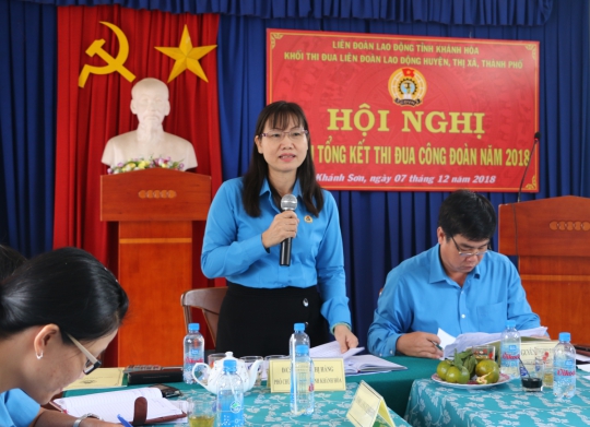 Đồng chí Nguyễn Thị Hằng – Phó Chủ tịch Thường trực LĐLĐ tỉnh đánh giá cao những nỗ lực của khối huyện trong thời gian qua, đồng thời đề nghị các cấp CĐ cần triển khai những hoạt động thiết thực cho người lao động trong dịp Tết sắp đến: Quan tâm đời sống khó khăn đoàn viên NLĐ trong đợt bão, lụt vừa qua. Kiểm tra, giám sát việc thực hiện chế độ tiền lương, thưởng nhân dịp Tết cho NLĐ. Tiếp tục thực hiện Chương trình phúc lợi cho đoàn viên, tích cực vận động các nhà tài trợ hỗ trợ kinh phí chăm lo cho NLĐ.