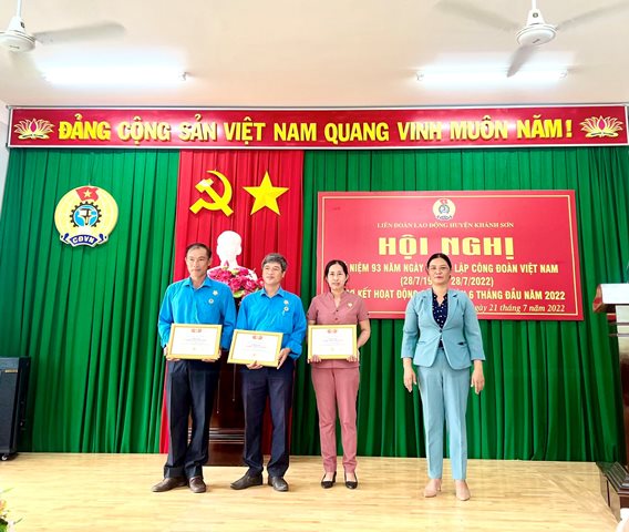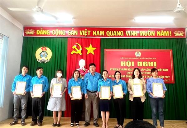 Trong dịp kỷ niệm này, có 03 đồng chí cán bộ công đoàn cơ sở trực thuộc LĐLĐ huyện Khánh Sơn được vinh dự đón nhận Kỷ niệm chương “Vì sự nghiệp xây dựng tổ chức công đoàn” do Tổng LĐLĐ Việt Nam trao tặng; đồng thời Lãnh đạo LĐLĐ huyện Khánh Sơn đã trao biểu dương và khen thưởng 08 đơn vị CĐCS đã có thành tích xuất sắc trong triển khai thực hiện giai đoạn 1, Chương trình: “01 triệu sáng kiến, nỗ lực vượt khó, sáng tạo, quyết tâm chiến thắng đại dịch Covid-19”