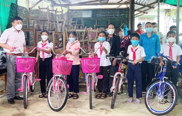 Trước đó, Liên đoàn Lao động huyện Khánh Vĩnh phối hợp với Công ty TNHH Fujiura Nha Trang trao 05 chiếc xe đạp cho các em học sinh lớp 5, tặng 50 cái balo cho các em học sinh Trường tiểu học Khánh Thành có hoàn cảnh khó khăn với tổng giá trị quà là 18 triệu đồng.