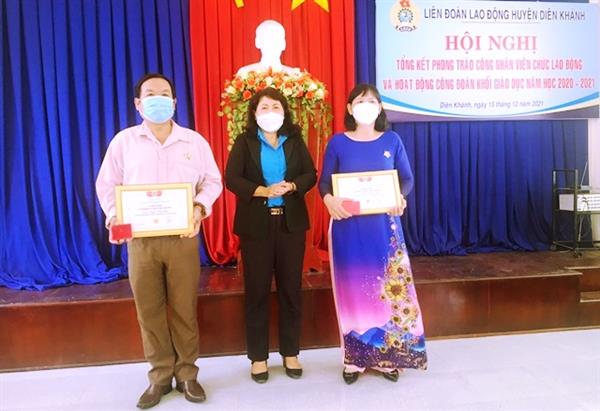 Bên cạnh đó, các hoạt động chăm lo đoàn viên, NLĐ luôn được các cấp Công đoàn thường xuyên quan tâm như: Hỗ trợ khó khăn cho đoàn viên nhân dịp tết Nguyên đán; Tháng Công nhân; hỗ trợ khó khăn do ảnh hưởng dịch Covid-19, kinh phí xây nhà “Mái ấm Công đoàn”.. (gần 100 đoàn viên được hỗ trợ với 75 triệu đồng)… Phong trào thi đua xây dựng tổ chức công đoàn hoàn thành tốt nhiệm vụ được duy trì và phát triển nâng cao chất lượng, hiệu quả. Năm học 2020-2021, nhiều tập thể, cá nhân đã lập được thành tích xuất sắc được công đoàn cấp trên tặng khen thưởng, điển hình: CĐCS Trường THCS Phan Chu Trinh; Trường TH Diên Thọ; Trường TH Diên Phú 1; Trường Mầm non Thị trấn….
