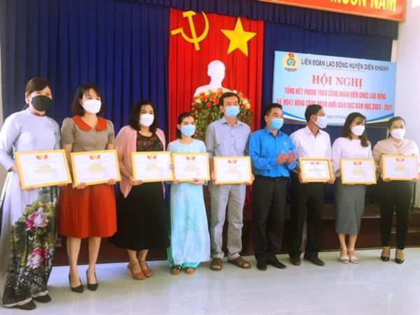 Tại hội nghị, LĐLĐ tỉnh khen 11 tập thể, 09 cá nhân; LĐLĐ huyện khen: 14 tập thể, 73 cá nhân và 20 CĐCS có vị trí cao tại các khối thi đua CĐCS năm học 2020-2021. Nhân dịp này, có 02 đồng chí được nhận Kỷ niệm chương vì sự nghiệp xây dựng tổ chức công đoàn và 01 đồng chí được trao nhận giải thưởng khuyến khích về cuộc thi “Nét đẹp cán bộ công đoàn” trên mạng xã hội facebook Công đoàn Khánh Hòa.