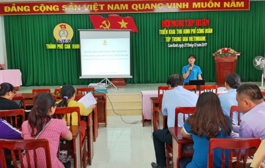 Thực hiện Chỉ đạo của Tổng Liên đoàn Lao động Việt Nam, ngày 27/12 Liên đoàn Lao động thành phố Cam Ranh tổ chức hội nghị tập huấn triển khai thu kinh phí công đoàn khu vực sản xuất kinh doanh qua Ngân hàng TMCP Công thương Việt Nam (Vietinbank) năm 2017. Về dự và triển khai có đồng chí Vũ Thị Yên - Phó Chủ tịch LĐLĐ thành phố và 56 Chủ tịch, kế toán Công đoàn cơ sở và kế toán các doanh nghiệp trên địa bàn thành phố.