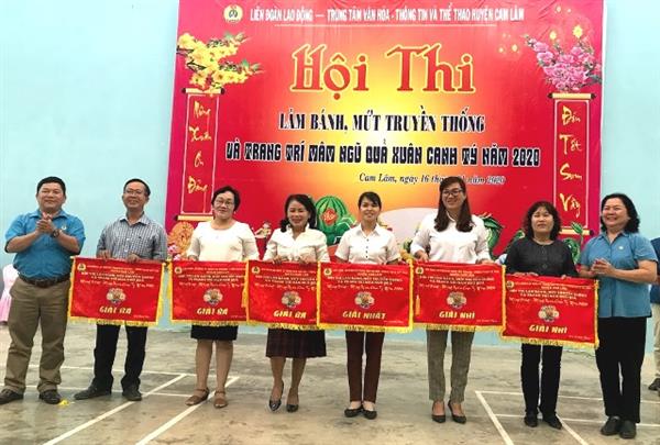 Trong không khí cả nước đón chào xuân mới và chào mừng kỷ niệm 90 năm Ngày thành lập Đảng Cộng sản Việt Nam (03/02/1930 - 03/02/2020), Đại hội Đảng các cấp tiến tới Đại hội Đại biểu toàn quốc lần thứ XIII của Đảng và mừng Tết Nguyên Đán cổ truyền của dân tộc. Ngày 16/01/2020, Liên đoàn Lao động phối hợp với Trung tâm văn hóa, thông tin và thể thao huyện Cam Lâm tổ chức hội thi bánh mứt truyền thống và trang trí mâm ngũ quả xuân Canh Tý– 2020.