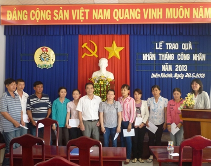 Ngày 28.5, Liên đoàn Lao động huyện Diên Khánh tổ chức gặp mặt và trao 10 suất quà trị giá 5.000.000đ cho Công nhân lao động có hoàn cảnh khó khăn nhân dịp “Tháng công nhân” năm 2013; đồng thời động viên, thăm hỏi ân cần đến từng gia đình CNLĐ. Qua đó, vận động đoàn viên phấn đấu hoàn thành xuất sắc các nhiệm vụ được giao, tiếp tục hưởng ứng các hoạt động CĐ do LĐLĐ huyện phát động.