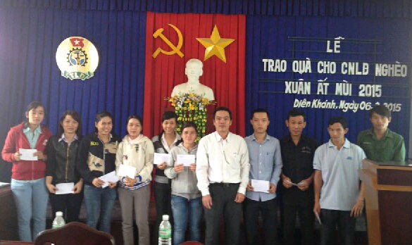 Nhân dịp Tết Nguyên đán Ất Mùi năm 2015, sáng ngày 06/02, Liên đoàn Lao động huyện Diên Khánh tổ chức buổi gặp mặt và trao tặng 15 phần quà với tổng trị giá 4,5 triệu đồng cho đoàn viên công đoàn và người lao động có hoàn cảnh khó khăn, góp phần cho CNLĐ vui xuân đón tết.