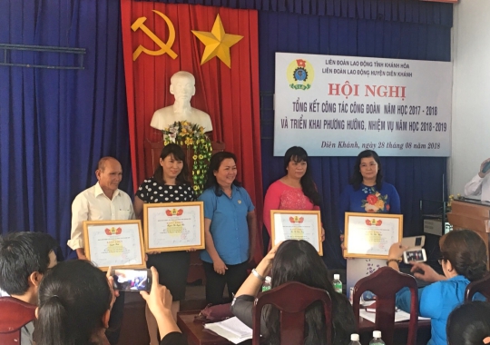 Ghi nhận thành tích trong năm học qua, 01 tập thể, 01 cá nhân được Tổng LĐLĐ VN tặng bằng khen; LĐLĐ tỉnh Khánh Hòa tặng bằng khen cho 08 tập thể, 04 cá nhân; LĐLĐ huyện đã khen thưởng 19 tập thể, 61 cá nhân, tặng cờ thi đua cho 05 đơn vị dẫn đầu khối thi đua CĐCS và khen thưởng 20 đơn vị đứng vị trí nhất, nhì, ba… trong khối thi đua CĐCS năm học 2017-2018.