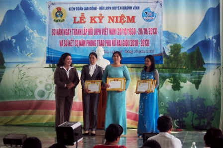 Nhân dịp này LĐLĐ huyện Khánh Vĩnh trao giấy khen cho 04 tập thể và 10 cá nhân có thành tích xuất sắc sơ kết 03 năm phong trào “Giỏi việc nước, đảm việc nhà” (2010-2012).