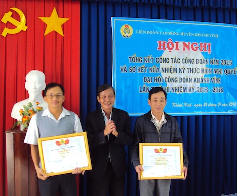Với những thành tích đạt được, LĐLĐ tỉnh tặng bằng khen cho 4 tập thể và 2 cá nhân; LĐLĐ huyện Khánh Vĩnh tặng giấy khen cho 10 tập thể và 12 cá nhân đã có thành tích xuất sắc trong phong trào thi đua xây dựng cơ quan và tổ chức Công đoàn vững mạnh năm 2015.