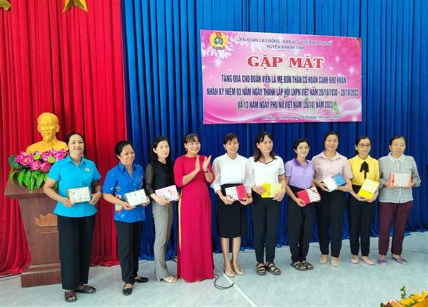 Nhân kỷ niệm Ngày Phụ nữ Việt Nam (20/10), LĐLĐ huyện Khánh Vĩnh phối hợp với Ban vì sự tiến bộ phụ nữ huyện tổ chức tọa đàm, gặp mặt tặng quà cho các mẹ đơn thân, nuôi con nhỏ có hoàn cảnh khó khăn.