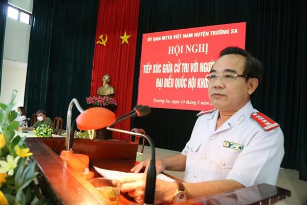 Sáng ngày 14/5, tại huyện đảo Trường Sa đã diễn ra hội nghị tiếp xúc giữa cử tri với người ứng cử đại biểu Quốc hội khóa XV. Tham gia hội nghị với sự có mặt của đoàn Đại biểu Quốc hội gồm 5 đồng chí, đại diện Chỉ huy Vùng 4 hải quân, Lãnh đạo UBND huyện Trường Sa, đại diện cử tri là cán bộ, chiến sỹ Lữ đoàn 146, đại diện cử tri là cán bộ, công nhân viên chức huyện Trường Sa.