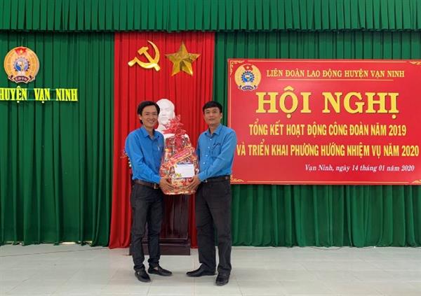 Năm 2019, là năm kỷ niệm 90 năm ngày thành lập Công đoàn Việt Nam (28/7/1929-28/7/2019) với chủ đề “Vì lợi ích đoàn viên công đoàn”, ngay từ đầu năm, LĐLĐ huyện Vạn Ninh đã phát động và tổ chức thực hiện nhiều hoạt động thiết thực: Tổ chức ký kết chương trình phúc lợi cho đoàn viên công đoàn với Bưu điện huyện về bán bảo hiểm xe máy và Công ty TNHH Quỳnh Anh Vạn Ninh về sử dụng các dịch vụ của Công ty; Hội thi “Tiếng hát cán bộ công nhân viên chức và người lao động huyện Vạn Ninh lần thứ 4”; Hội thao Công nhân viên chức lao động huyện Vạn Ninh năm 2019; đưa đoàn 85 cán bộ công đoàn (ủy viên BCH, Ủy ban Kiểm tra LĐLĐ huyện và chủ tịch, phó chủ tịch các CĐCS trực thuộc) dâng hương và tham quan Khu tưởng niệm chiến sĩ Gạc ma tại huyện Cam Lâm. Toàn huyện đã thực hiện 33 công trình sản phẩm (trong đó có 01 công trình sản phẩm cấp huyện và 32 công trình sản phẩm cấp cơ sở ) với tổng trị giá trên 100 triệu đồng.