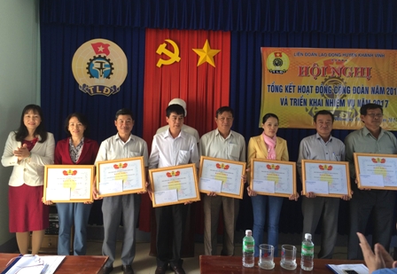 Ghi nhận thành tích năm 2016, LĐLĐ tỉnh tặng Cờ thi đua xuất sắc khối LĐLĐ huyện, tặng Bằng khen cho 07 tập thể và 03 cá nhân; LĐLĐ huyện tặng giấy khen cho 14 tập thể và 17 cá nhân đã có thành tích xuất sắc trong phong trào thi đua xây dựng tổ chức công đoàn vững mạnh.