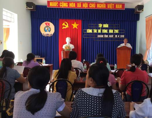 Thực hiện chương trình công tác năm 2016, vừa qua, Liên đoàn Lao động huyện Khánh Vĩnh đã tổ chức lớp tập huấn nghiệp vụ công tác Nữ công năm 2016. Trưởng Ban Nữ công LĐLĐ tỉnh Hồ Thị Phương Chi cùng 35 Trưởng ban Nữ công Công đoàn Giáo dục, tổ trưởng tổ nữ công CĐCS trực thuộc tham dự.