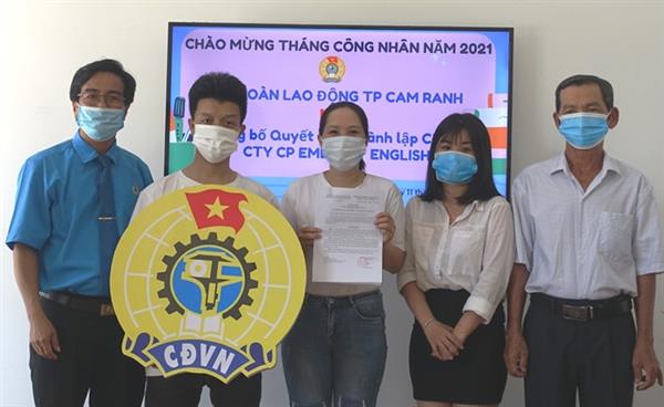 Hưởng ứng Tháng công nhân năm 2021, sáng 11/5/2021, Liên đoàn Lao động thành phố Cam Ranh tổ chức Lễ công bố Quyết định kết nạp đoàn viên và thành lập Công đoàn cơ sở Công ty CP EMBASSY ENGLISH.