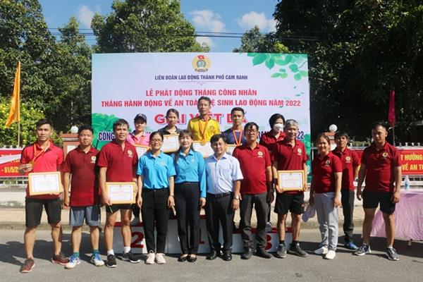 Lãnh đạo LĐLĐ tỉnh và TP. Cam Ranh chụp ảnh lưu niệm cùng các vận động viên