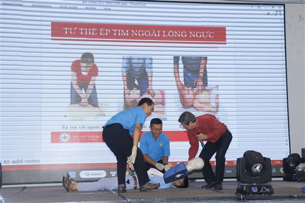 Các đại biểu tham dự được hướng dẫn thực hành về các kỹ năng sơ cứu quan trọng, cơ bản trong lao động.