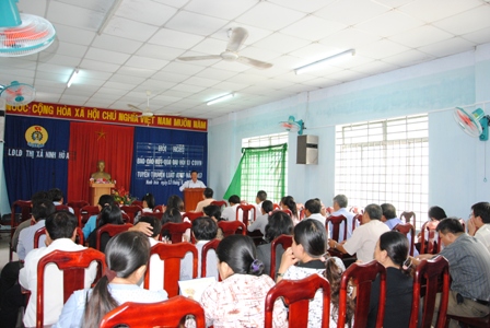 Cùng ngày, LĐLĐ thị xã Ninh Hoà tổ chức tập huấn tuyên truyền Luật ATGT cho 75 cán bộ, đoàn viên, CNVCLĐ. Với chủ đề “Nâng cao tinh thần trách nhiệm của người thực thi công vụ và ý thức tự giác của người tham gia giao thông”, nội dung tập huấn nhằm nâng cao ý thức trách nhiệm, tính chuyên nghiệp, đạo đức nghề nghiệp của người thực thi công vụ trên lĩnh vực bảo đảm trật tự an toàn giao thông; từng bước tăng cường hơn nữa công tác tuyên truyền, phổ biến giáo dục pháp luật về bảo đảm TTATGT, nâng cao nhận thức chấp hành pháp luật ATGT của người tham gia giao thông, xây dựng văn hóa giao thông trong cộng đồng, nhất là đội ngũ CNVCLĐ nhằm thực hiện tốt khẩu hiệu hành động “Công nhân, viên chức, lao động thị xã Ninh Hòa gương mẫu thực hiện năm ATGT 2013”.