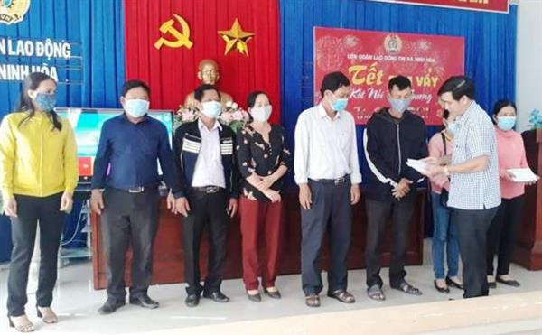 Tại buổi gặp mặt đồng chí Nguyễn Hữu Nam - Thị ủy viên, Chủ tịch LĐLĐ thị xã Ninh Hòa thăm hỏi, động viên và gửi lời chúc Tết đến đoàn viên và gia đình; đồng thời trao 13 suất với giá trị mỗi suất 1 triệu đồng từ nguồn Hỗ trợ của Quỹ Xã hội từ thiện Tấm Lòng Vàng; trao 09 suất mỗi suất trị giá 2 triệu đồng và 13 suất (mỗi suất trị giá 500.000 đồng) từ nguồn Ngân sách Công đoàn và Quỹ Xã hội Công đoàn Khánh Hòa.