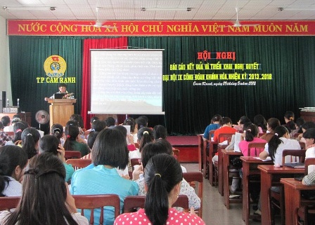 Sáng ngày 9-5, Liên đoàn Lao động thành phố Cam Ranh tổ chức Hội nghị báo cáo kết quả và triển khai Nghị quyết Đại hội IX Công đoàn tỉnh Khánh Hoà nhiệm kỳ 2013-2018. Đồng thời quán triệt các văn bản mới của Tổng Liên đoàn lao động Việt Nam về công tác tài chính công đoàn cho gần 200 cán bộ công đoàn và kế toán công đoàn của 118 công đoàn cơ sở.