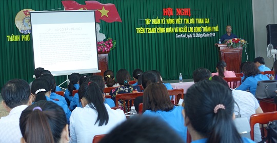 Nhằm nâng cao hiệu quả hoạt động của chuyên trang “Công đoàn và người lao động” trên Cổng Thông tin điện tử thành phố Cam Ranh, sáng ngày 13/9/2018, Liên đoàn Lao động thành phố phối hợp với Phòng Văn hoá – Thông tin thành phố Cam Ranh tổ chức tập huấn kỹ năng viết tin, bài cho 150 Công đoàn cơ sở trực thuộc.