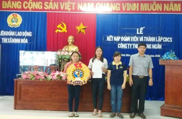 Chiều ngày 10/4/2021, tại Hội trường cơ quan LĐLĐ thị xã Ninh Hòa đã tổ chức Lễ kết nạp đoàn viên và thành lập công đoàn cơ sở công ty TNHH Dung Ngân. Tham dự và chỉ đạo buổi Lễ có đồng chí Nguyễn Hữu Nam - Thị ủy viên, Chủ tịch LĐLĐ thị xã Ninh Hòa.