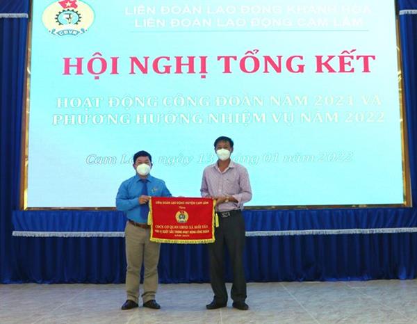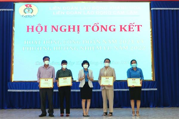 Năm 2021 là năm hết sức khó khăn đối với huyện Cam Lâm do ảnh hưởng nghiêm trọng của dịch bệnh Covid – 19, nhiều doanh nghiệp lớn kinh doanh trong lĩnh vực du lịch, dịch vụ phải ngừng hoạt động, có hơn 3.000 người lao động bị mất việc làm từ năm 2020 đến nay vẫn phải nghỉ việc. Trong hoàn cảnh đó, các cấp công đoàn toàn huyện cũng đã cố gắng thực hiện một số nhiệm vụ đã đặt ra đầu năm như: Chỉ đạo có 18/19 doanh nghiệp có từ 10 lao động trở lên tổ chức hội nghị người lao động , Ký kết 21 bản thỏa ước lao động tập thể , thành lập 02 Công đoàn cơ sở mới, vận động đoàn viên, người lao động tham gia hiến máu nhân đạo với 256 đơn vị máu sạch, xây dựng 114 cơ quan đơn vị, doanh nghiệp văn hóa. Các cấp công đoàn đã giới giới thiệu 120 đoàn viên ưu tú cho Đảng xem xét kết nạp, tư vấn pháp luật miễn phí và tuyên truyền bộ Luật lao động cho 130 cán bộ, đoàn viên. Ngoài ra Liên đoàn Lao động huyện còn tổ chức 3 lớp tập huấn cho 264 lượt cán bộ công đoàn.