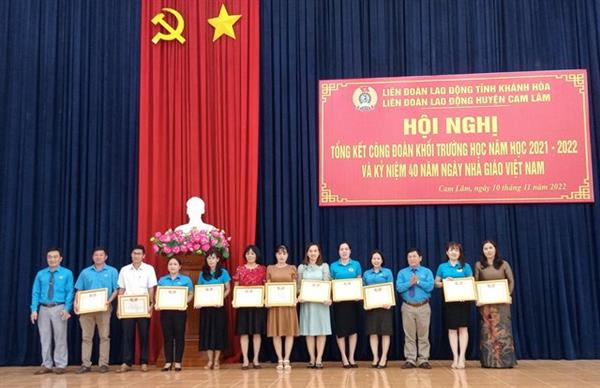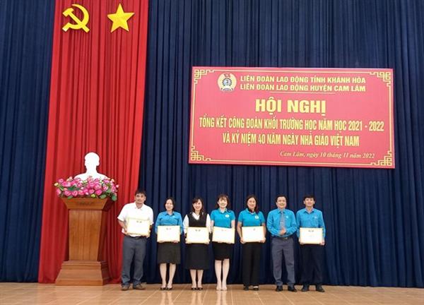 Nhằm đánh giá hoạt động Công đoàn khối trường học, Liên đoàn Lao động (LĐLĐ) huyện Cam Lâm tổ chức hội nghị tổng kết hoạt động Công đoàn khối trường học năm học 2021-2022. Tham dự buổi tổng kết có đ/c Bùi Đăng Thành – Phó Chủ tịch Liên đoàn Lao động tỉnh Khánh Hòa, đ/c Trần Xuân Tây – Phó Bí thư Thường trực Huyện ủy.