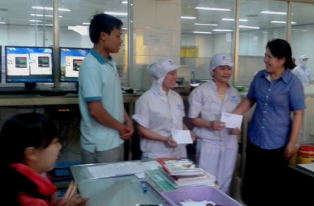 Nhân dịp này, LĐLĐ huyện đã thăm hỏi, động viên và trao 10 phần quà trị giá 5.000.000đ cho 10 công nhân lao động có hoàn cảnh khó khăn.