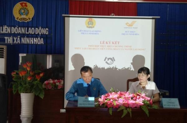 Lễ ký kết phúc lợi đoàn viên giữa LĐLĐ thị xã và Bưu điện thị xã Ninh Hòa