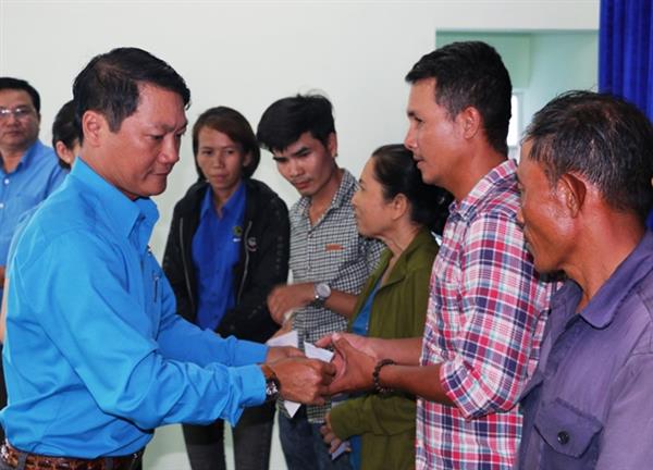 Đồng chí Ngô Anh Duyệt – Chủ tịch LĐLĐ TP. Nha Trang tặng quà cho ngư dân khó khăn