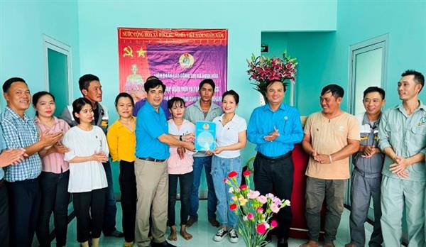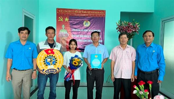 Lãnh đạo LĐLĐ thị xã trao quyết định kết nạp đoàn viên công đoàn