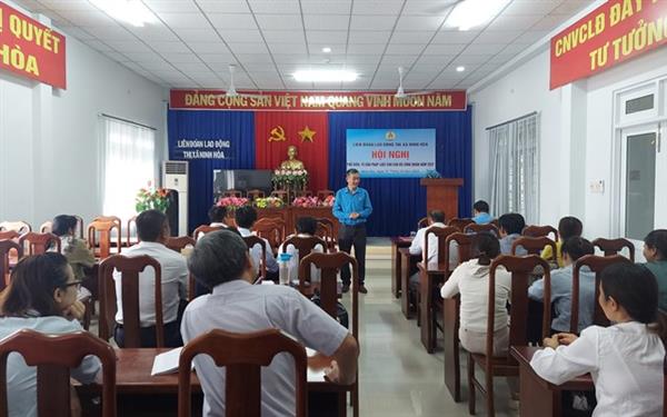 Sáng 26/8/2022, Liên đoàn Lao động thị xã Ninh Hòa tổ chức Hội nghị phổ biến, tư vấn pháp luật cho cán bộ công đoàn cơ sở khối doanh nghiệp năm 2022. Tham dự có đồng chí Trần Duy Khải - Phó Chủ tịch LĐLĐ thị xã cùng hơn 50 đồng chí Chủ tịch, Phó chủ tịch CĐCS doanh nghiệp trực thuộc.