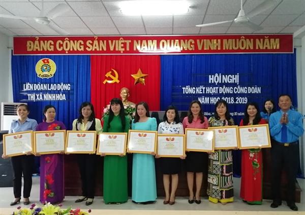 Hiện nay, LĐLĐ thị xã trực tiếp quản lý 96 CĐCS trường học với hơn 3.200 đoàn viên công đoàn. Tiếp tục triển khai thực Nghị quyết 29-NQ/TW về việc đổi mới căn bản, toàn diện giáo dục và đào tạo, năm học 2018 - 2019, LĐLĐ thị xã đã phối hợp chặt chẽ với Phòng Giáo dục & đào tạo thị xã Ninh Hòa trong công tác chỉ đạo hoạt động công đoàn ở các trường học, thực hiện tốt các chức năng chăm lo đời sống, đại diện bảo vệ quyền, lợi ích hợp pháp, chính đáng của cán bộ, giáo viên, người lao động; tham gia phối hợp tốt với chính quyền hoàn thành xuất sắc nhiệm vụ chính trị được giao. Kết quả 100% các trường học đã tổ chức tốt hội nghị Cán bộ viên chức cơ quan. Các chế độ chính sách đối với nhà giáo được thực hiện đầy đủ, kịp thời; công tác tuyên truyền, tổ chức phong trào thi đua, hoạt động xã hội từ thiện được phát động và triển khai hiệu quả. Qua kết quả đánh giá xếp loại CĐCS năm học 2018-2019, có 88 CĐCS (tỷ lệ 91,67%) đạt CĐCS vững mạnh.