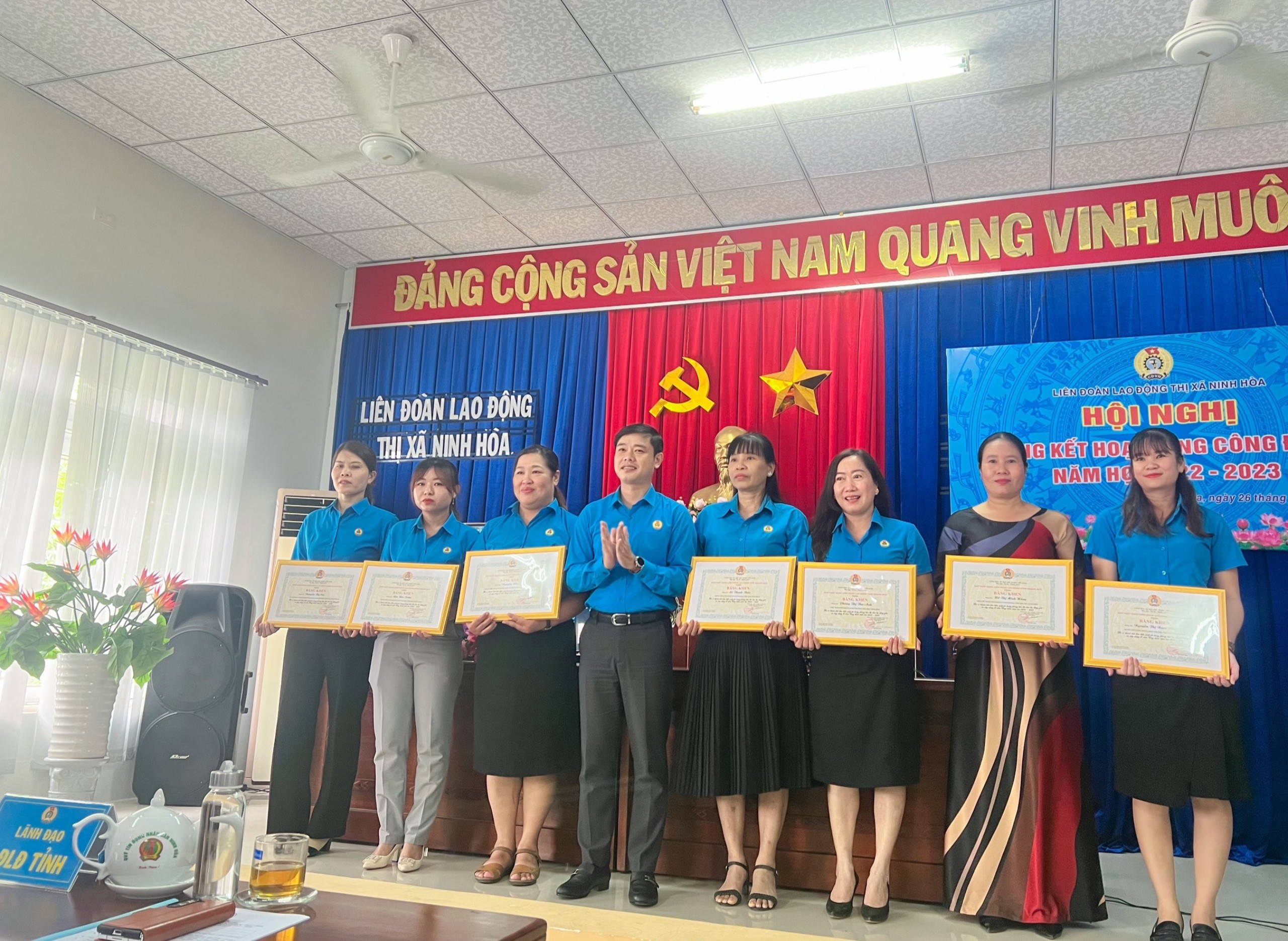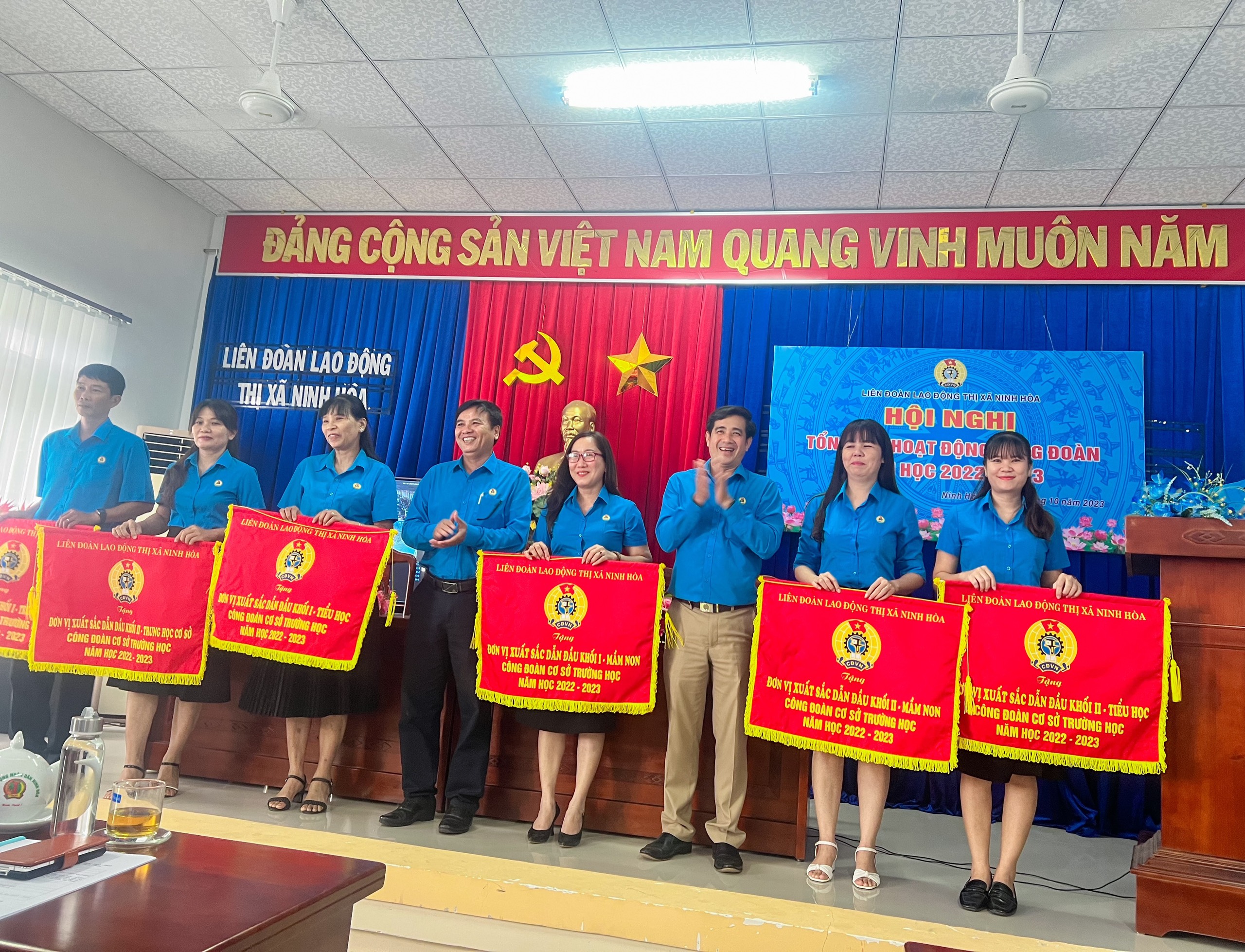 Năm học 2022-2023, được sự quan tâm, chỉ đạo kịp thời của cấp ủy Đảng, chính quyền, Công đoàn cấp trên, sự phối hợp nhịp nhàng, đồng bộ giữa chính quyền và công đoàn cùng cấp, đội ngũ cán bộ, viên chức, người lao động (CBVCNLĐ) ngành Giáo dục thị xã Ninh Hòa đã không ngừng nỗ lực phấn đấu, khắc phục những tồn tại, hạn chế, tập trung triển khai thực hiện tốt nghị quyết Đại hội Công đoàn các cấp, những nhiệm vụ trọng tâm trong chiến lược giáo dục, đào tạo của ngành và chương trình, nhiệm vụ công tác công đoàn, góp phần hoàn thành thắng lợi các chỉ tiêu, nhiệm vụ năm học 2022 –2023.